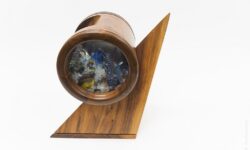 “Dragon’s Lair” an edition limited to only 5 Kaleidosculptures. For the sculpture I’ve used mixed media, designed and made with exotic woods, filigreed steel and brass designs, copper, glass, mirror, acrylic and found objects. Placing transparent items inside reflective surfaces creates a lens effect, pulling the flashes and flairs from…