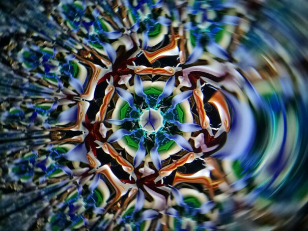 In an oil-filled kaleidoscope, the object cell contains a viscous liquid — typically mineral oil, glycerin, or silicone — along with glass beads, crystals, and other decorative elements. The liquid slows everything down. Objects drift and float rather than tumble, which produces patterns that evolve gradually and respond to even the smallest movement.